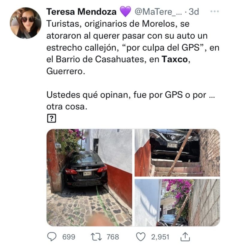 “Turistas, originarios de Morelos, se atoraron al querer pasar con su auto un estrecho callejón, “por culpa del GPS”, en el Barrio de Casahuates, en Taxco, Guerrero. Ustedes qué opinan, fue por GPS o por … otra cosa”