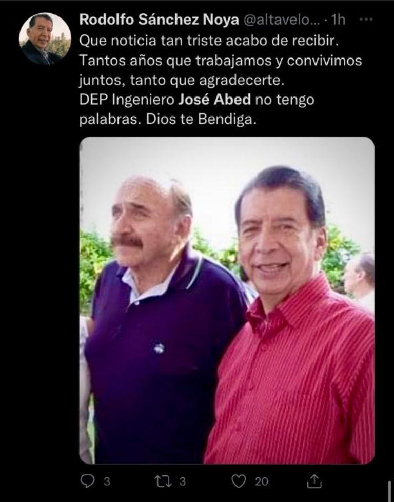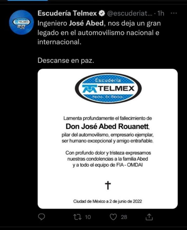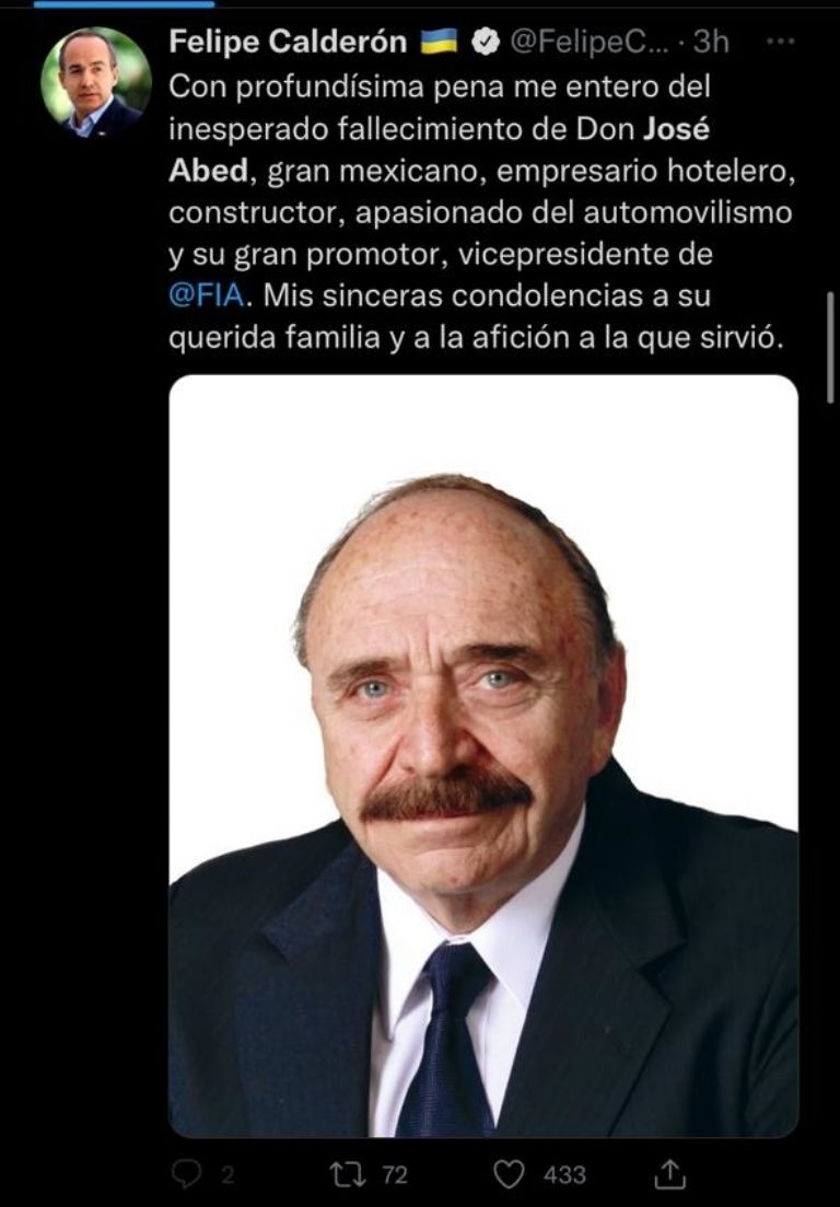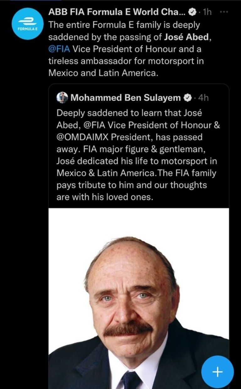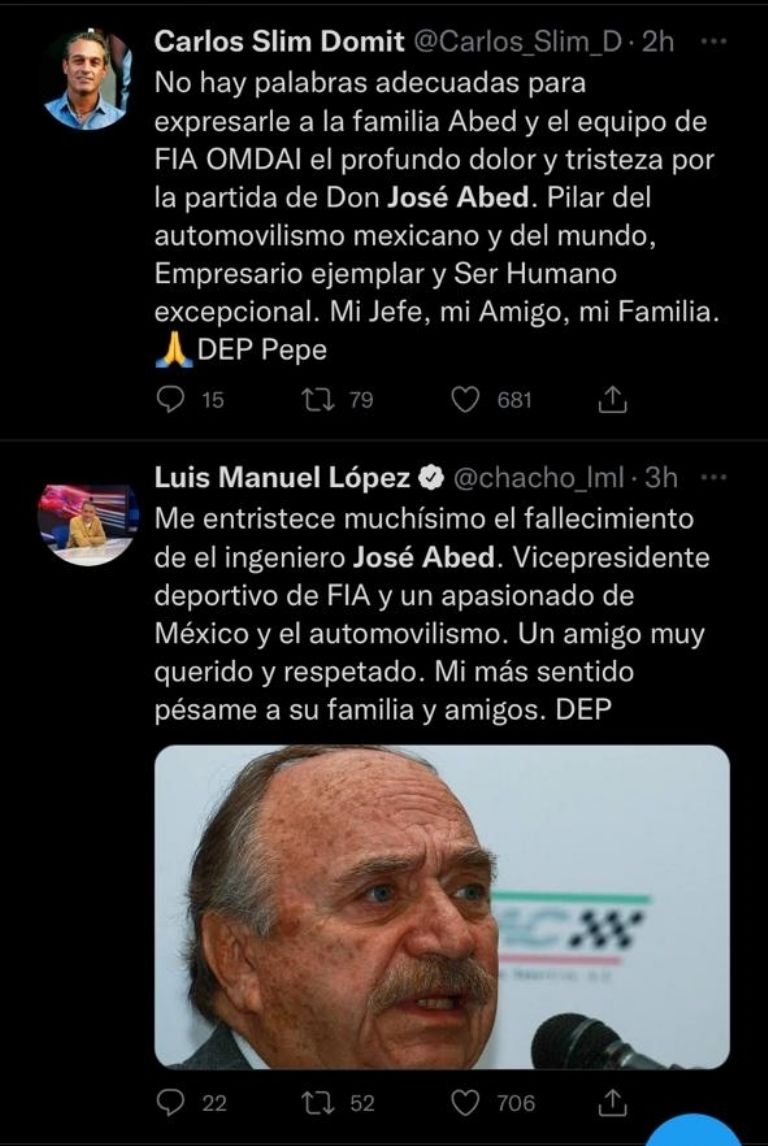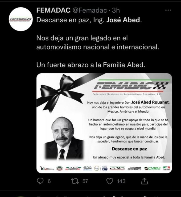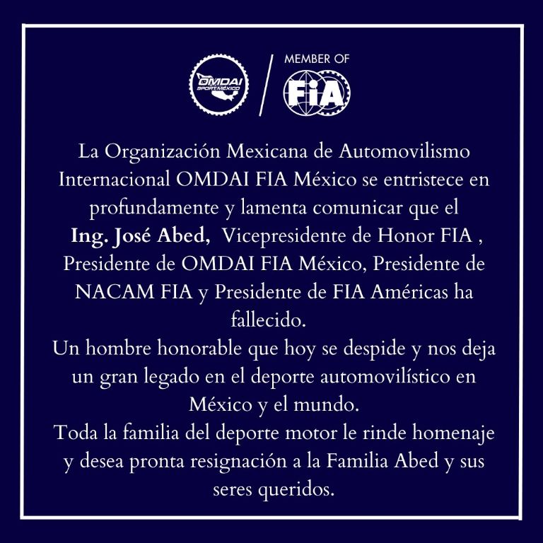 "Me siento profundamente triste de saber que José Abed, Vicepresidente de Honor de la FIA y Presidente de OMDAIMX, ha fallecido.(...) José dedicó su vida al automovilismo en México y América Latina. La familia FIA le rinde homenaje y nuestros pensamientos están con sus seres queridos", escribió Ben Sulayem.