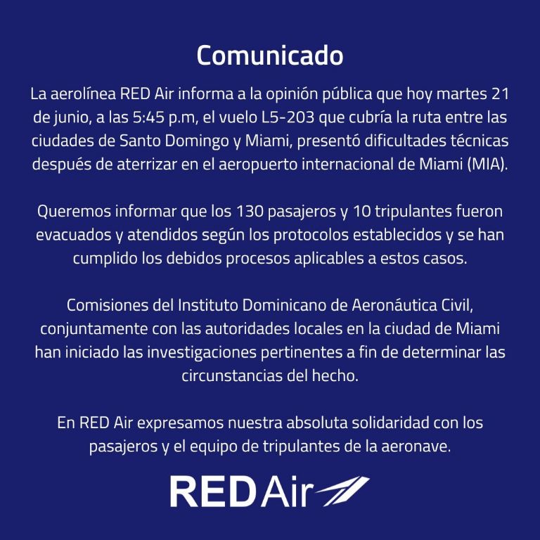 Al respecto, la aerolínea RED Air publicó a través de redes un comunicado en el que asegura que “130 pasajeros y 10 tripulantes fueron evacuados y atendidos según los protocolos establecidos y se han cumplido los debidos procesos aplicables a estos casos”.