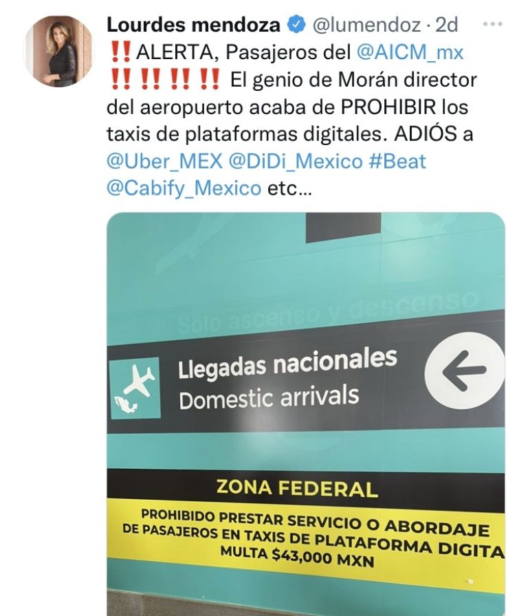 Fue el 24 de junio cuando la periodista Lourdes Mendoza informó a través de su cuenta de Twitter sobre las medidas que el Aeropuerto Internacional de la Ciudad de México está tomando para evitar que choferes que conducen Uber, Didi, Cabify y Beat recojan pasajeros, tanto en la Terminal 1 como en la Terminal 2. Aunque esta es una ley que desde hace algún tiempo ya estaba en vigor, hasta apenas se está haciendo valer.