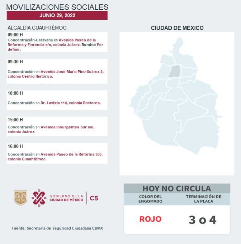 El C5 también le recuerda a todos los automovilistas que este miércoles 29 junio de 2022 aplica el Hoy No Circula en la CDMX y el Estado de México para los autos con engomado rojo, terminación de placa 3 y 4.