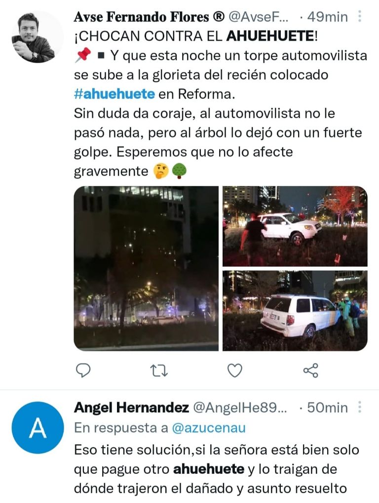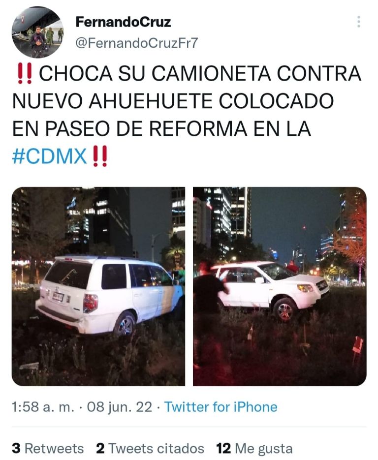 Usuarios de Twitter comenzaron a compartir fotografías y videos sobre la camioneta Honda Pilot blanca que se impactó contra el ahuehuete colocado en Paseo de la Reforma, en la CDMX.