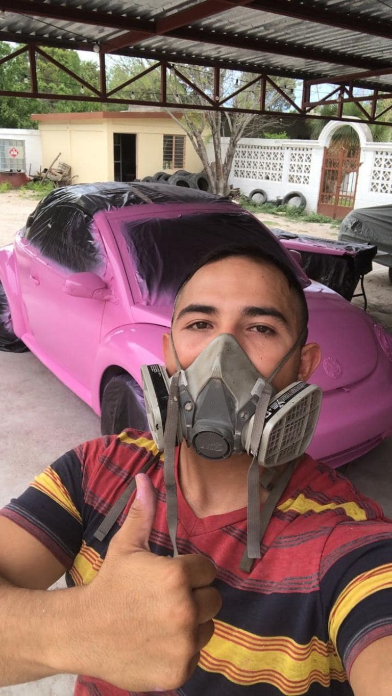 En las fotografías, se alcanza a ver como José Vicente cubrió el área de las llantas, el parabrisas, los faros y los asientos con una especie de plástico negro, para asegurarse de que el color quedara solamente en la carrocería.