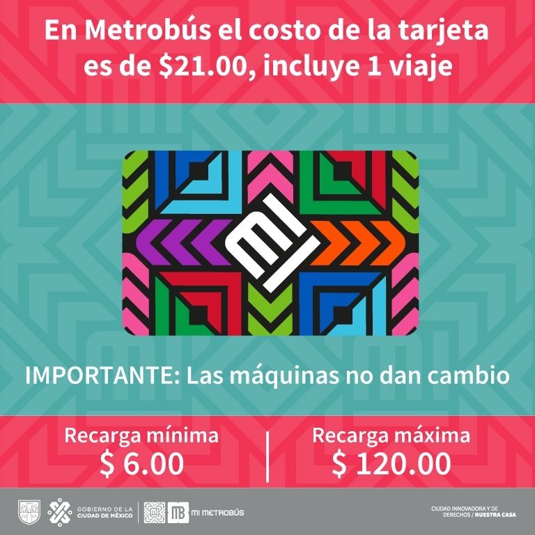 En caso de que sea la primera vez que vas a acceder al Metrobús y no cuentes con dicha tarjeta, esta la podrás adquirir en las máquinas de recarga ubicadas en las estaciones. Su costo es de $21.00, precio que incluye el pago por el plástico de la tarjeta y un viaje de $6.00.