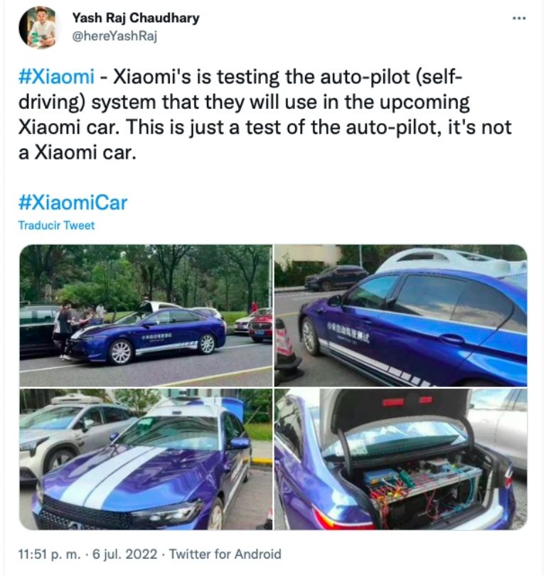 Todas estas teorías cobran sentido luego de que en la red social china llamada Weibo, un usuario compartiera una imagen en la que se ve un sedán color azul, que tiene la leyenda “Xiaomi Pilot Test”, que en español significa “Piloto de prueba de Xiaomi”.