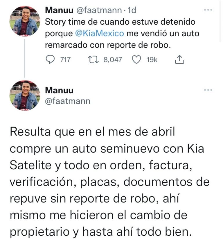 Recientemente Juan Manuel Medina Sosa se hizo viral viral tras compartir una serie de tweets en los que cuenta la triste y desagradable experiencia que acaba de vivir, luego de comprar un auto en una agencia autorizada de Kia en el Estado de México, y tiempo después ser detenido por las autoridades al demostrarle que tanto el engomado, como la verificación y el número de serie eran falsos.