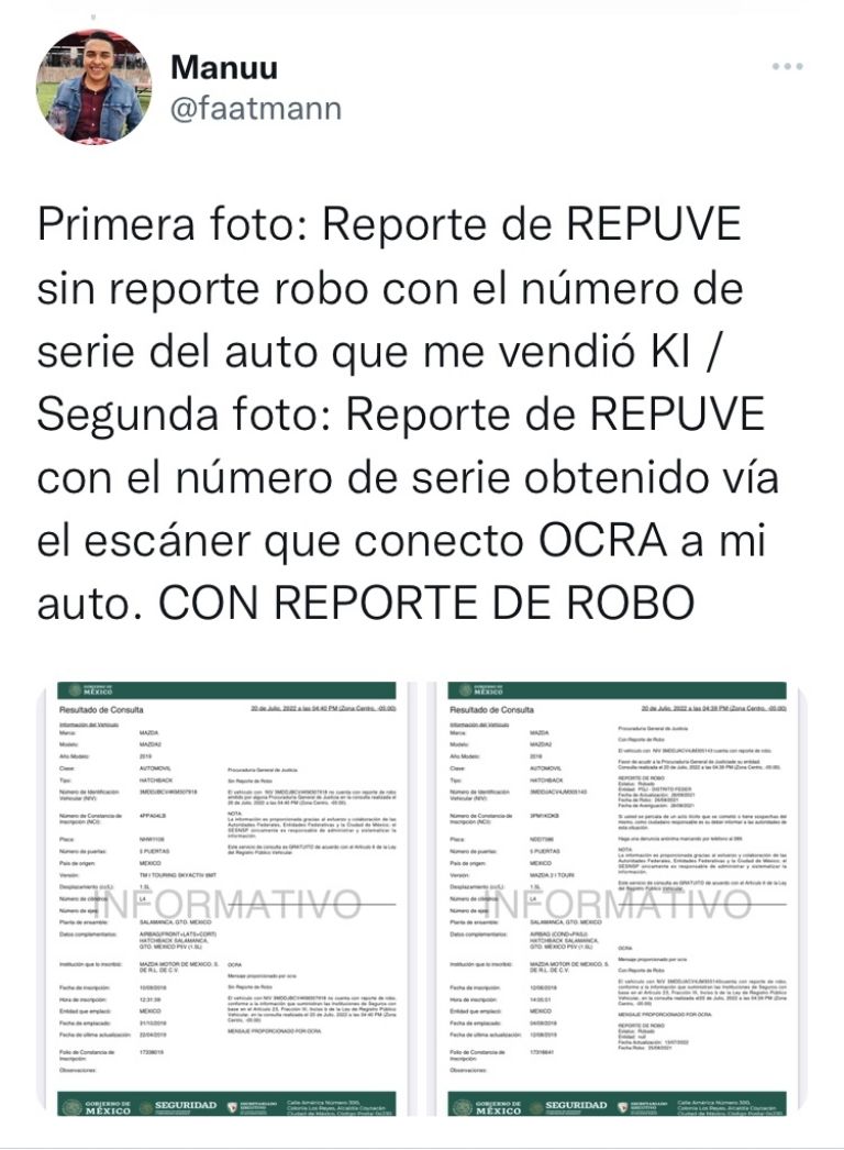 En su relato, el joven resalta que antes de hacer la compra, la misma agencia le mostró los documentos que avalaban que su auto no tenía reportes de robo y que estaba al día, aunado a esto Kia vendió el auto como si se tratara de un modelo 2019, cuando en el reporte REPUVE real se demuestra que es de un año anterior, es decir, 2018.