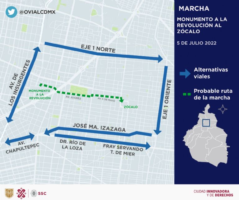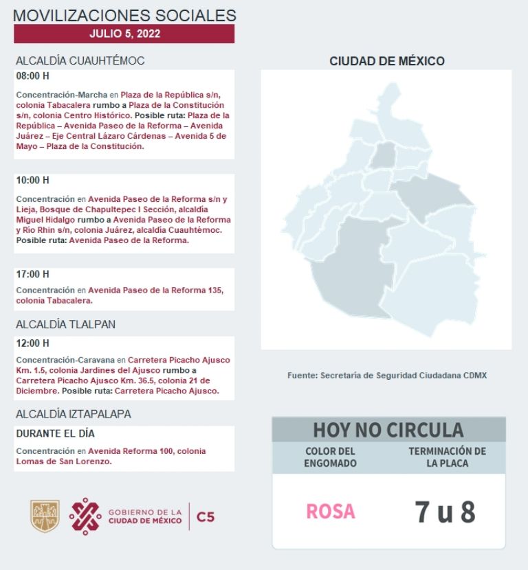 De acuerdo con el Centro de Comando, Control, Cómputo, Comunicaciones y Contacto Ciudadano (C5), estas son las alcaldías que se verán afectadas por las manifestaciones de este 5 de julio 2022: