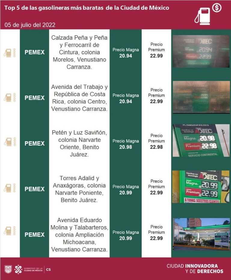 El Centro de Comando, Control, Cómputo, Comunicaciones y Contacto Ciudadano (C5) dio a conocer en qué gasolineras de la Ciudad de México (CDMX) es posible encontrar la gasolina más barata este 5 de julio de 2022, a fin de que conductores puedan ahorrar dinero a la hora de cargar el tanque de su auto y así cuidar su economía.