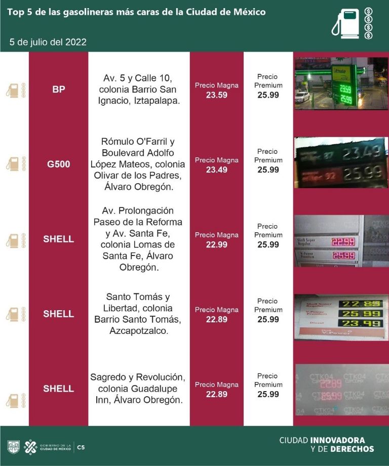 Por otro lado, hay 5 gasolineras en la CDMX que están vendiendo la gasolina más cara, comparadas con los demás establecimientos de combustible en la capital.