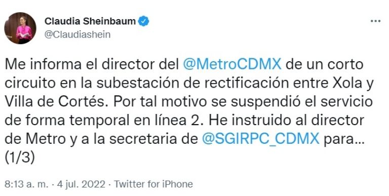 “Me informa el director del Metro, @GCalderon_Metro que en este momento se está restableciendo el servicio en la Línea 2. Sentimos las molestias que tuvieron l@s usuari@s”, señaló la mandataria.