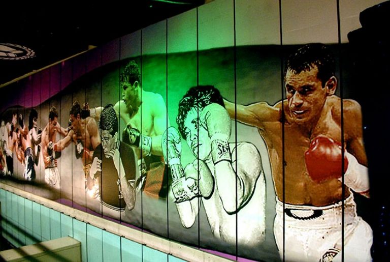 Con un total de más de 2 mil metros de murales que cubren la totalidad de las paredes, partes del techo, e incluso las escaleras, 47 figuras del boxeo son homenajeadas y recordadas por sus impresionantes hazañas en el cuadrilátero.