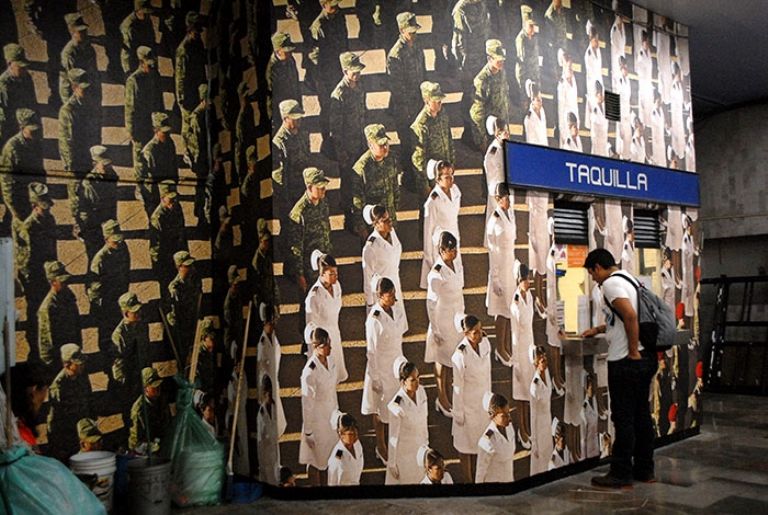 Como parte de la exposición, se instalaron fotografías a gran escala sobre los muros del Metro que muestran la imagen de militares destacados, además de escenas de la vida cotidiana de estos personajes al servicio de la nación.