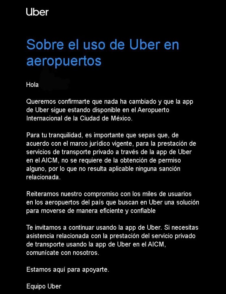 “Queremos confirmarte que nada ha cambiado y que la app de Uber sigue estando disponible en el Aeropuerto Internacional de la Ciudad de México. Te invitamos a continuar usando la app de Uber”