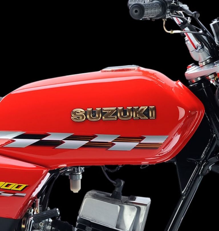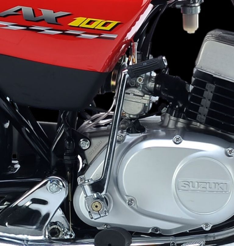 La Suzuki AX100 cuenta con un sistema de carburador de 2 tiempos, una potencia de 10 cv, una transmisión de 4 velocidades y un tanque de combustible con 12 litros de capacidad.