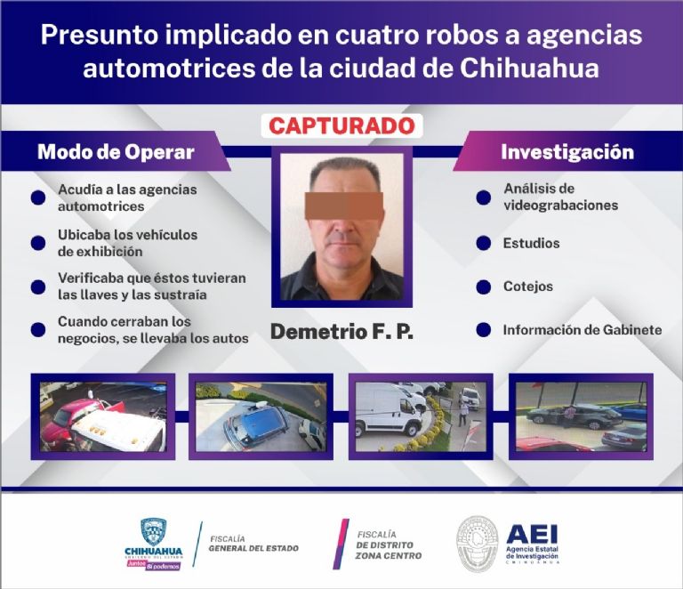 La Fiscalía General del Estado de Chihuahua informó sobre la detención de un presunto ladrón de autos que operaba en agencias automotrices de dicha ciudad; tras su captura, fue presentado ante un Juez de Primera Instancia para determinar su situación.