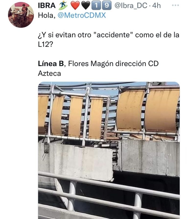 El usuario @Mr_Civico compartió una serie de fotografías de la estación Romero Rubio de la misma línea, en las que se puede ver un claro desgaste en la estructura. “Una de las ballenas del metro Romero Rubio, línea B, que corre de Buena Vista a Cd. Azteca, se está desgastando, no se sorprendan si ocurre lo mismo que en la Línea 12”