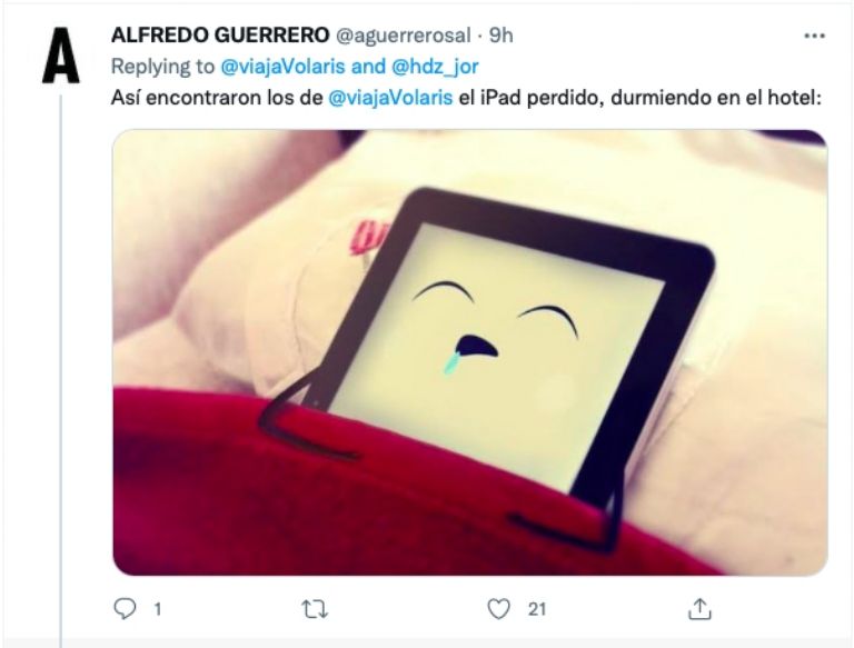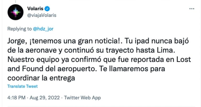 Como era de esperarse, el hilo rápidamente se hizo viral en twitter y en otras redes sociales, permitiendo que el equipo de Volaris se comunicara con Jorge Hernández para informarle que afortunadamente habían encontrado su iPad y que está le sería devuelta a la brevedad.