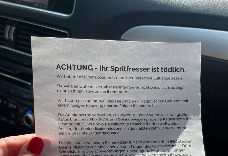 Hasta el momento, este grupo ha desinflado las llantas de más de 9,000 SUVs desde su creación y suele acompañar sus acciones con un mensaje en el parabrisas del vehículo, donde le expresa al dueño: “Tu auto me mata”.
