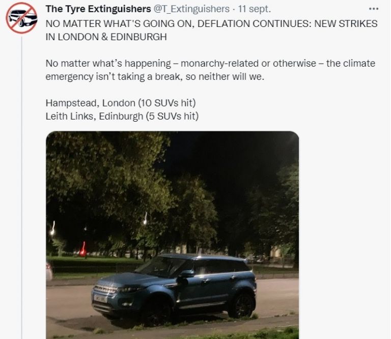Hace unos días, un grupo ecologista, denominado “The Tyre Extinguishers”, desinfló las llantas de 600 SUVs para pronunciarse en contra del cambio climático. Los hechos ocurrieron en países como Reino Unido, Francia, Alemania, Suiza, Países Bajos, Noruega, Canadá, Dinamarca y República Checa.