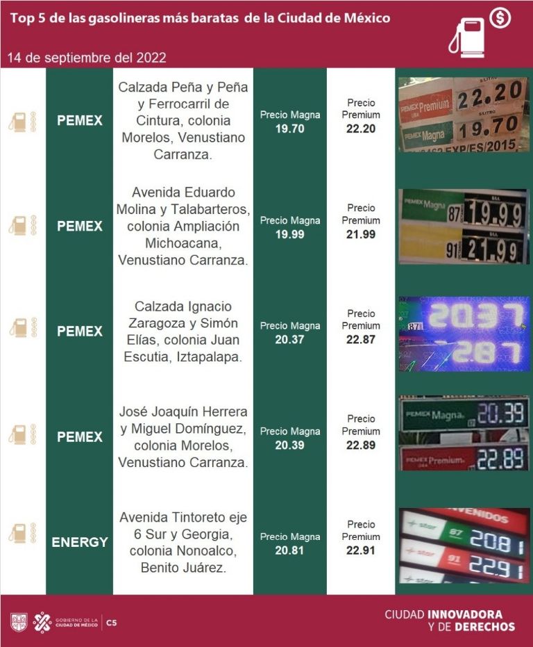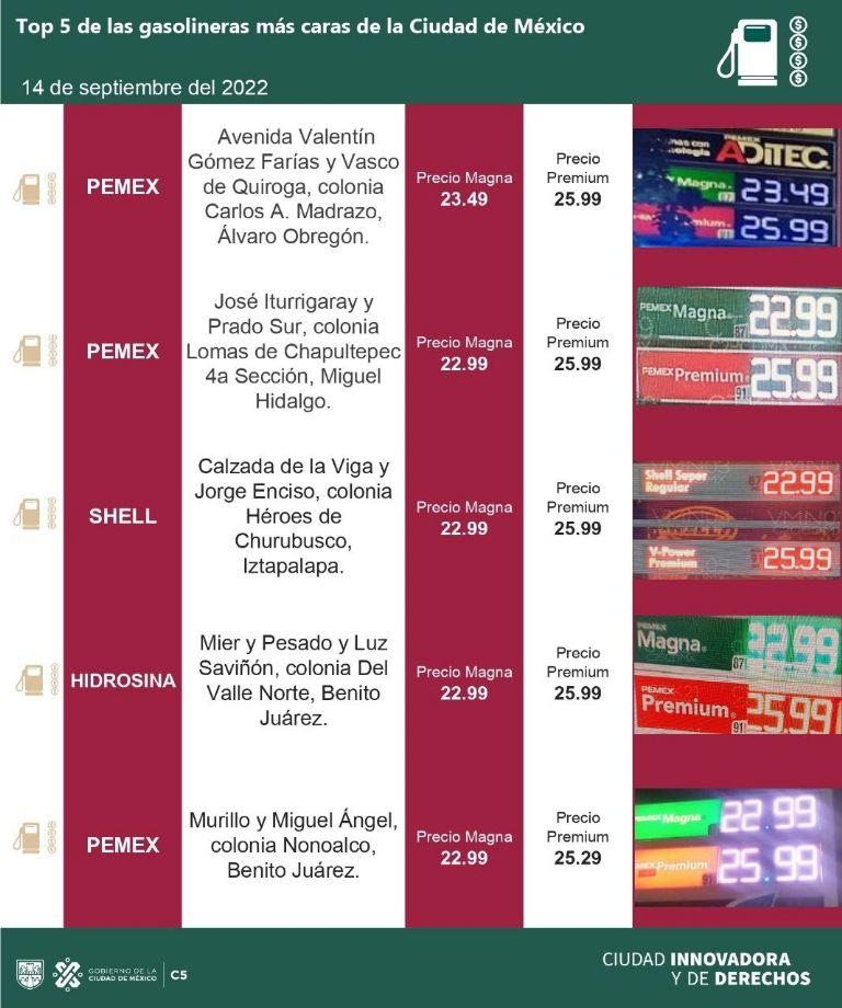 Por otro lado, hay 5 gasolineras en la CDMX que venden la gasolina más cara a comparación de otros establecimientos en la capital, así lo informó el C5 y detalló su ubicación para que automovilistas puedan decidir si acudir o no a ellas.