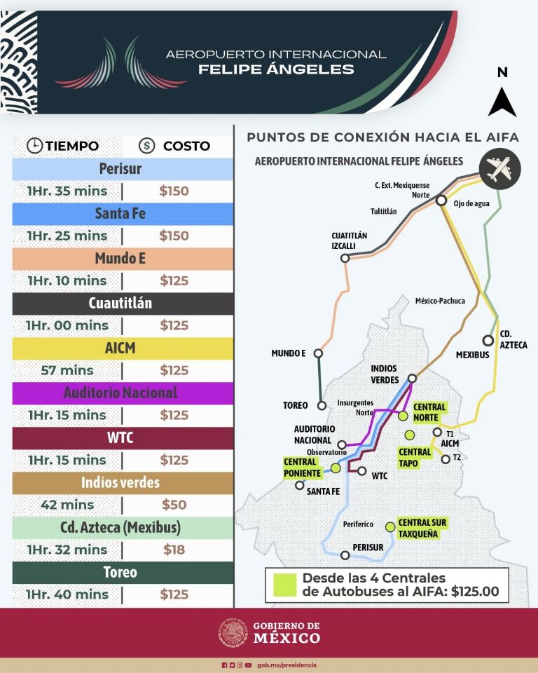 Si por otro lado necesitas tomar transporte público, el AIFA cuenta con un servicio que tiene diferentes paradas en la CDMX y el Edomex. Te compartimos aquí la ruta de este medio de transporte.