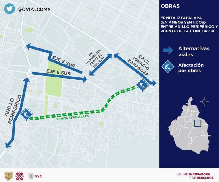 - Afectaciones por obras en ambos sentidos de Calz. Ermita Iztapalapa entre Anillo Periférico y Puente de la Concordia. Las alternativas viales son: Calzada Ignacio Zaragoza, Eje 6 Sur y Anillo Periférico.