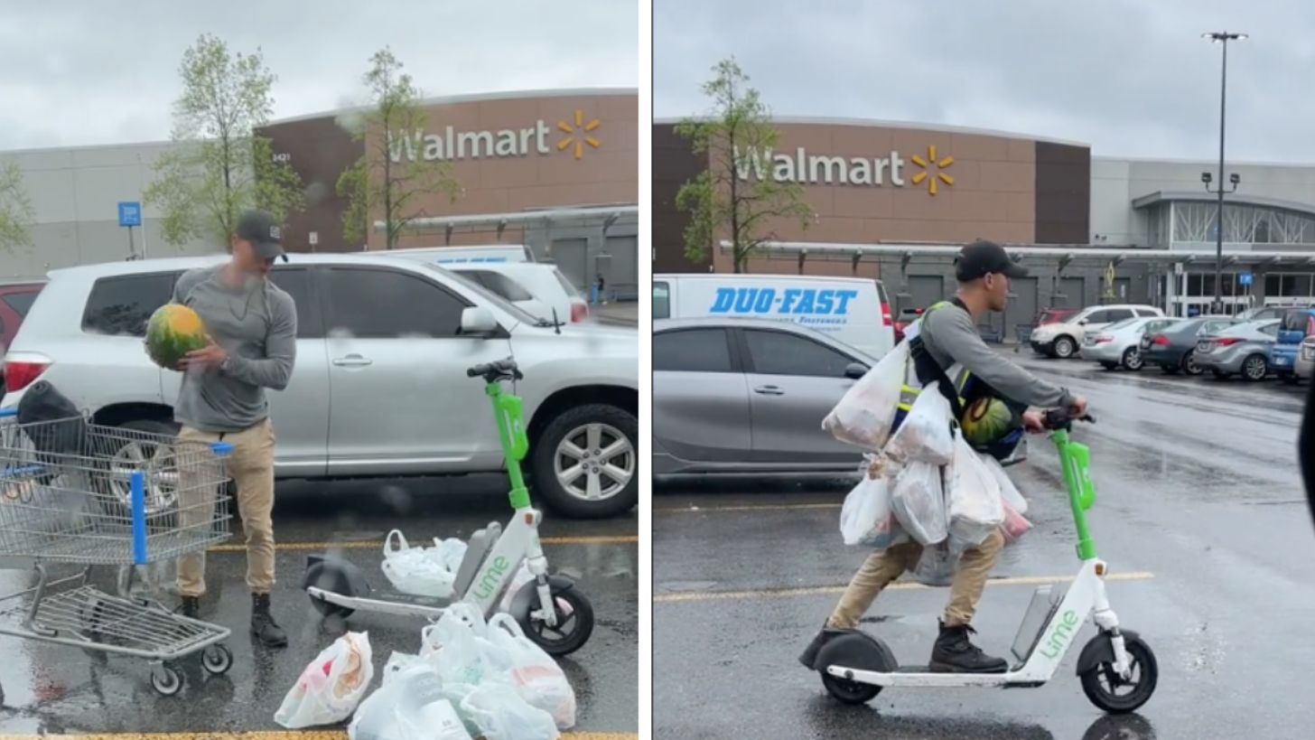 Sorprendentemente a su lado llega un joven con un carrito lleno de víveres que se detiene cerca de un scooter eléctrico. En los primeros segundos del clip, se ve como el joven empieza a bajar las bolsas y a colocarlas en el piso.