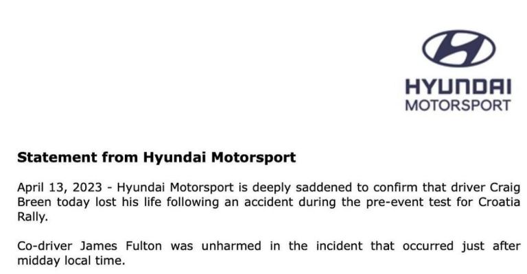 "Hyundai Motorsport se entristece profundamente al confirmar que el piloto Craig Breen ha perdido la vida hoy tras un accidente durante la prueba previa al Rally de Croacia".