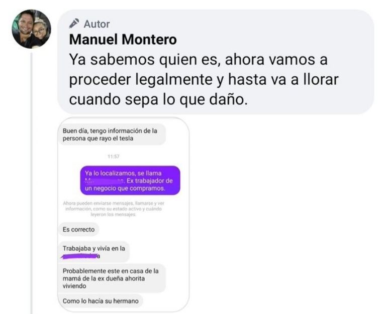 Este mismo ofreció de inicio una recompensa de $10,000 pesos y subió hasta $15,000 pesos, para quien le diera información sobre este hombre, internautas se enteraron de este suceso y se pusieron a investigar, dando con el perfil del agresor. El dueño del Tesla, tras haber recibido apoyo en sus redes, se mantenía informando sobre como estaba avanzando la investigación.