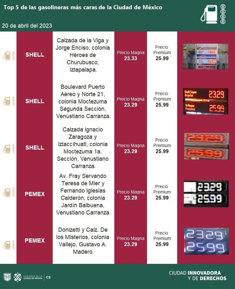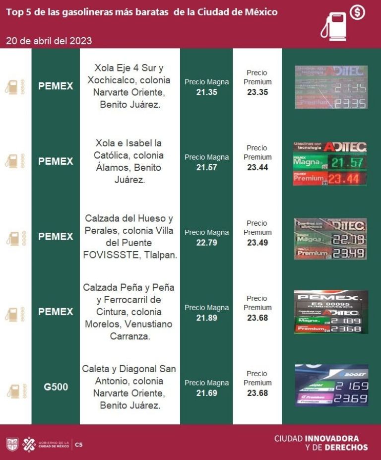 Para este jueves 20 de abril de 2023, el C5 nos da conocer a través de su cuenta de Twitter la información con la gasolina más barata y la gasolina más cara de la CDMX.