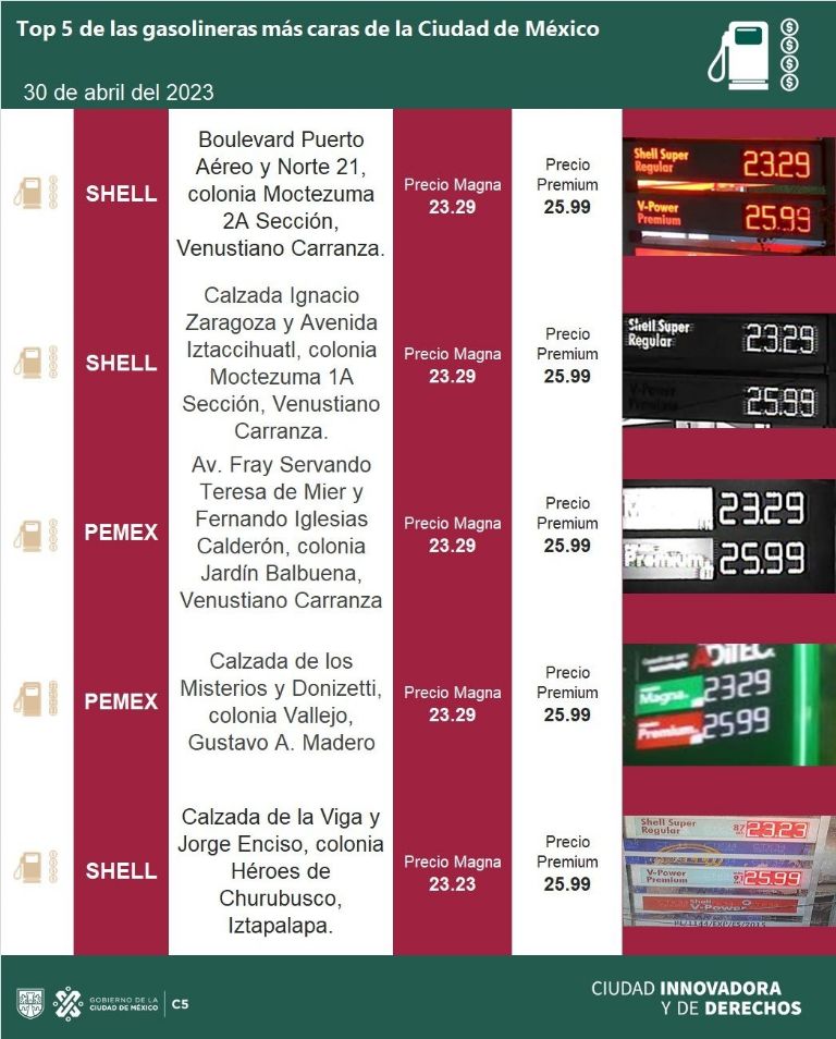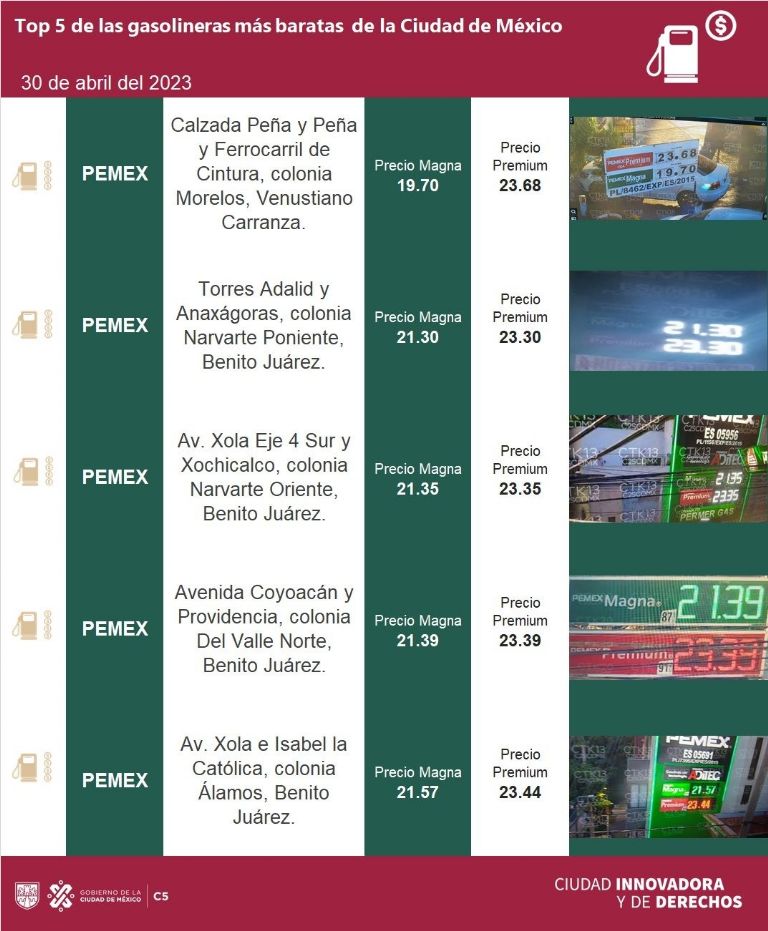 Para este domingo 30 de abril de 2023, el C5 nos da conocer a través de su cuenta de Twitter la información con la gasolina barata y la gasolina más cara de la CDMX.
