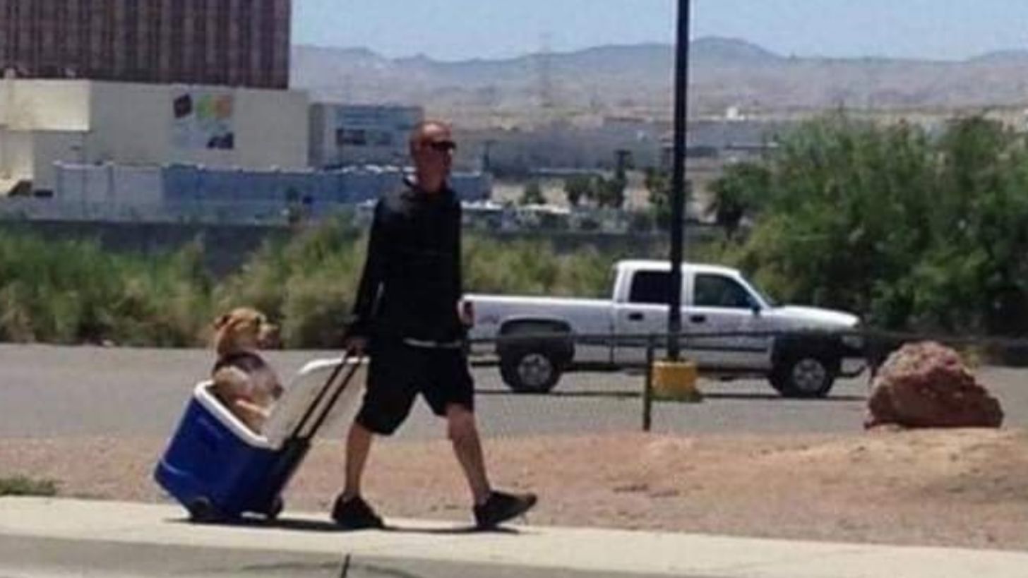 A través de la página de Facebook Pancho Blue El Refugio, se difundieron imágenes de este joven transitando por una calle, mientras cargaba detrás suyo una hielera abierta con ruedas, en la que se encontraba su perrito.
