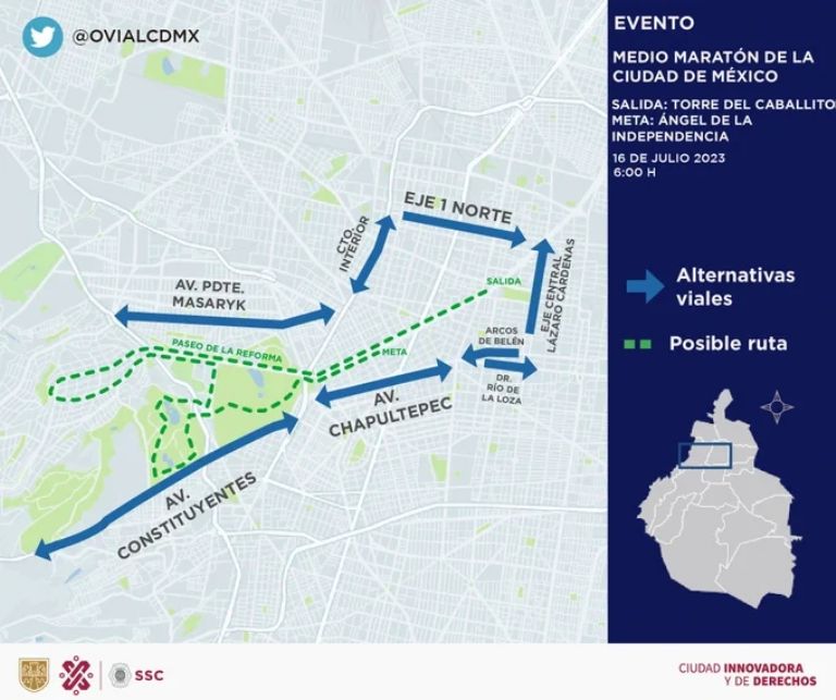 - Este domingo habrá afectación en Av. Paseo de la Reforma, por el Medio Maratón de la Ciudad de México que se llevará a cabo a las 06:00 horas. La ruta y las alternativas viales son las siguientes: