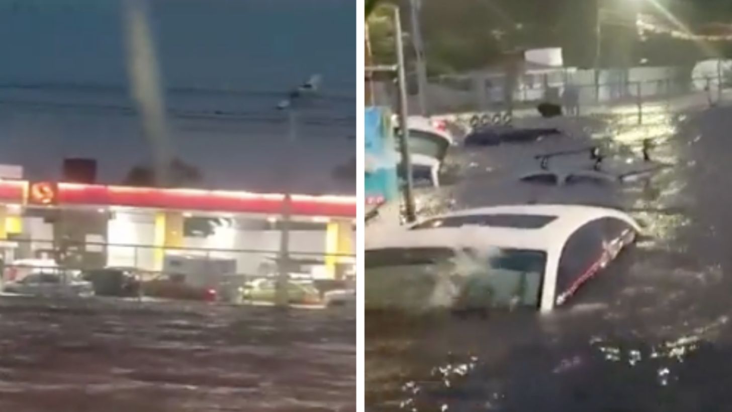 Uno de los clips más virales que ‘pasean’ por la red es el de un taxi que es arrastrado violentamente por la corriente; afortunadamente a su paso no había otros coches y pudo ser detenido por la barda de una casa de la zona.