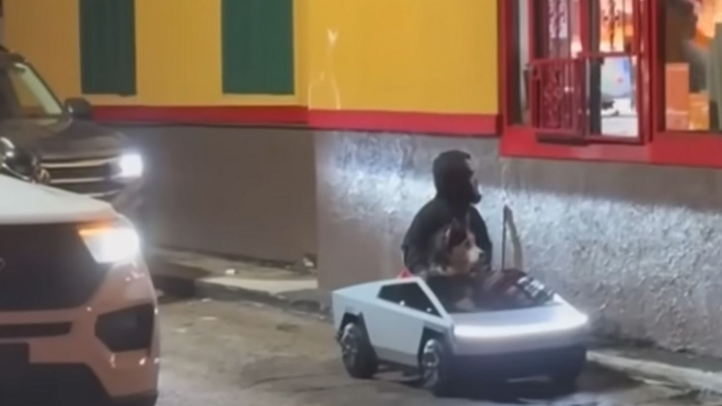 Esto pasó en MIami, y fue en un local de Popeyes, el cual es de pollo frito y cosas por el estilo, el dueño decidió ir con su Cybetruck de juguete, pero no sin estar acompañado de su amiguito más cercano, su perrito. Este perrito es un Husky muy tierno que se ve cómo también va disfrutando del viaje.