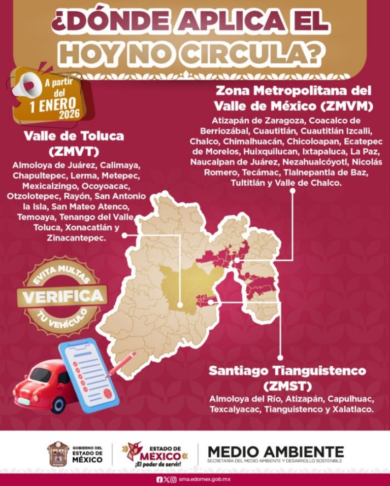 El programa Hoy No Circula, diseñado para reducir la contaminación atmosférica mediante restricciones a la movilidad de vehículos particulares, comenzó a aplicarse de forma obligatoria con sanciones en las zonas metropolitanas del Valle de Toluca y Santiago Tianguistenco desde el 1 de enero de 2026, así lo informó la Secretaría del Medio Ambiente y Desarrollo Sostenible del Estado de México.